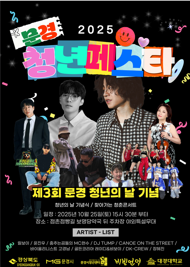 2025 문경 청년페스타 초청 공연 페이지 정보 작성일2025-10-27 22:58 관련링크 본문 2025 문경 청년페스타 초청 공연 목록 이전글2025 경북도민 상생캠퍼스 with 도천축제 2025.11.04 다음글2025 문경 청년페스타 초청 공연 2025.10.27